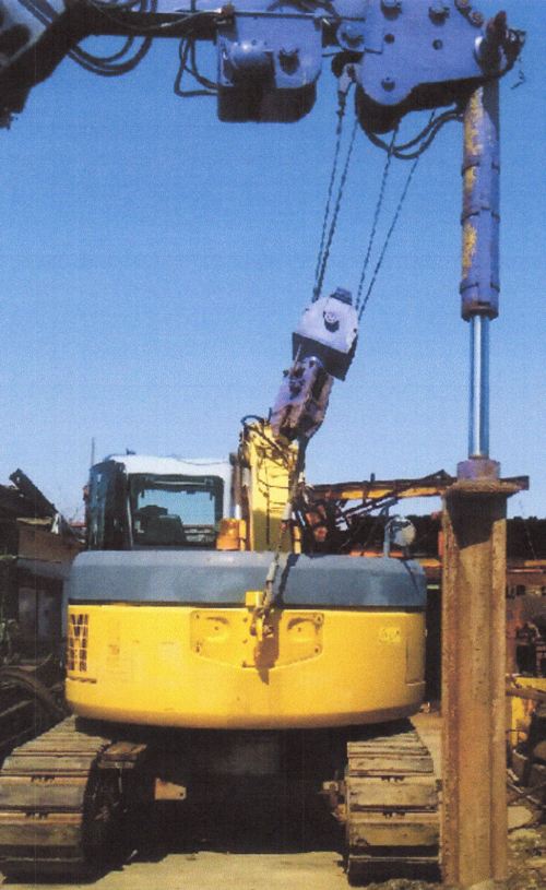 SK圧入工法は、油圧力で杭の圧入、引抜きが可能です。 対応車は、油圧ショベルを機体にして機動性がとても良いです。